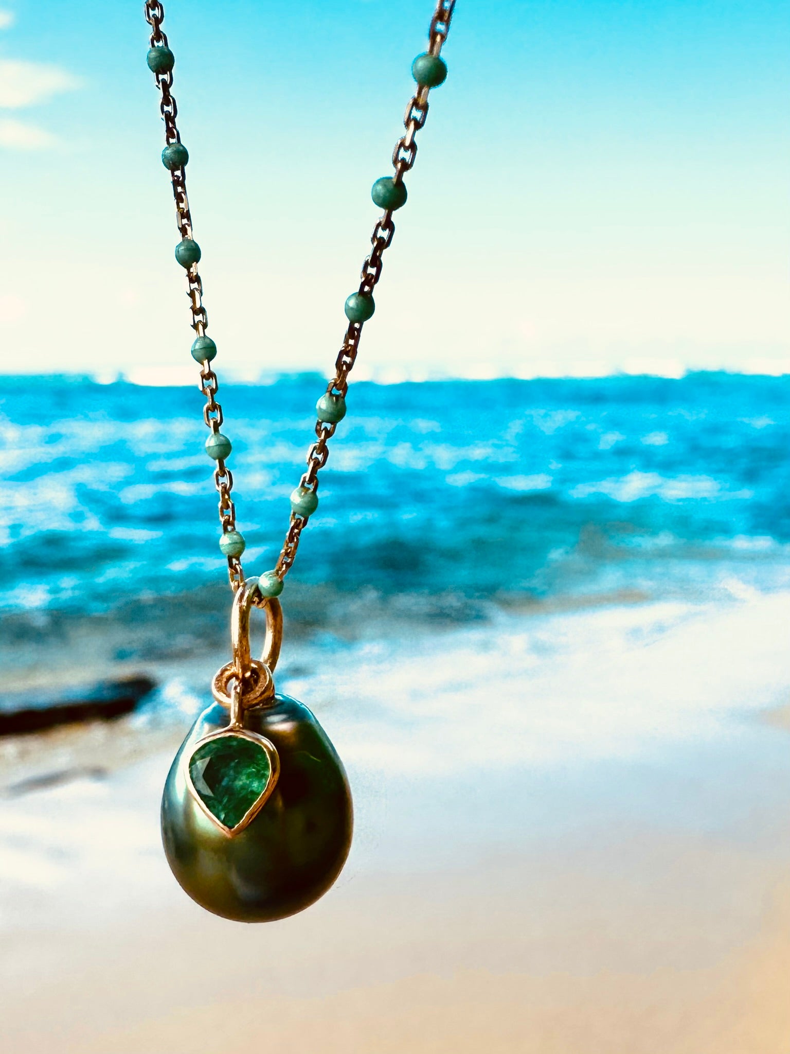 Tahitian pearl high luster with natural emerald 6 mm drop shape.