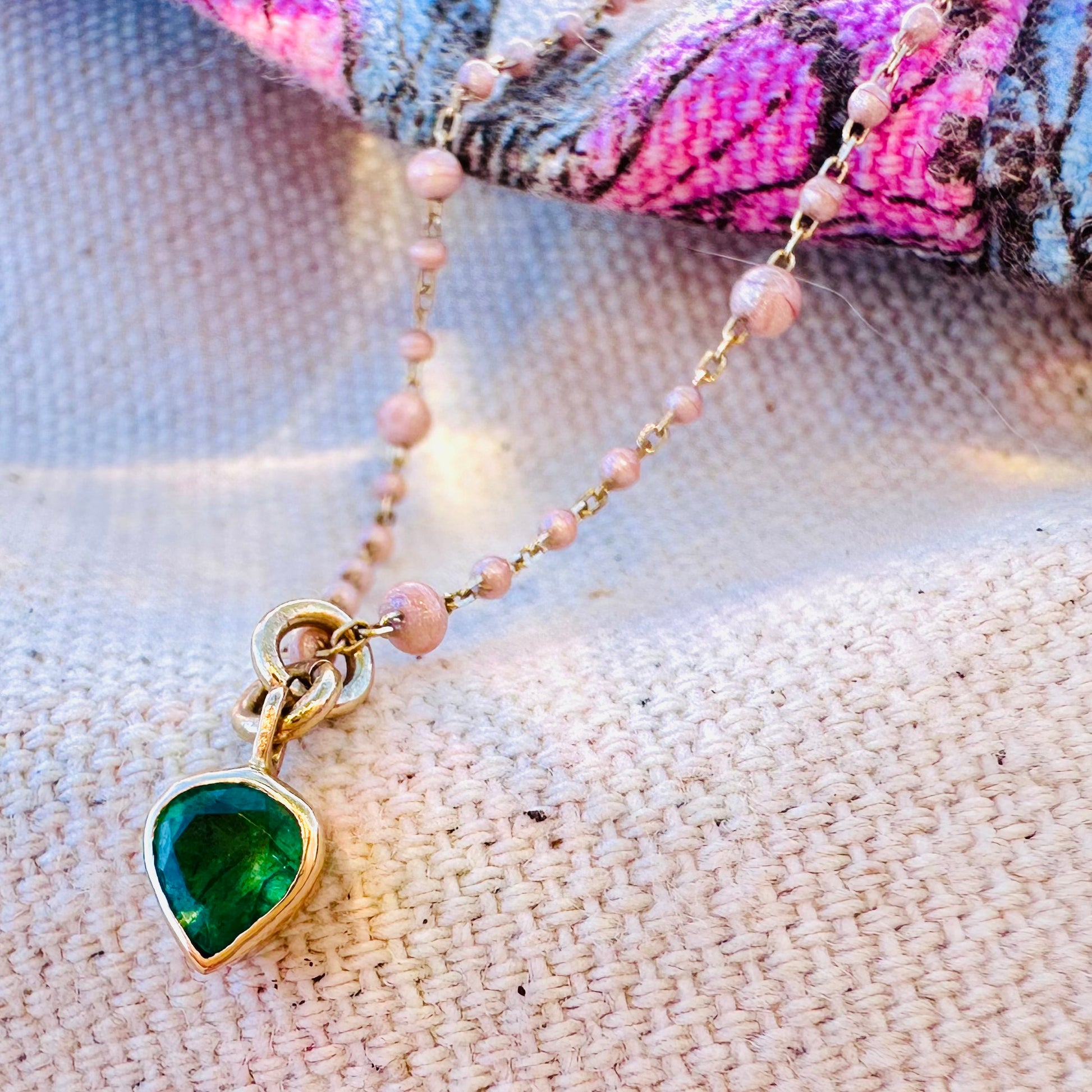 Natural small emerald , handmade pendant with pink enamel chain. The pendant measure 7 mm plus setting.