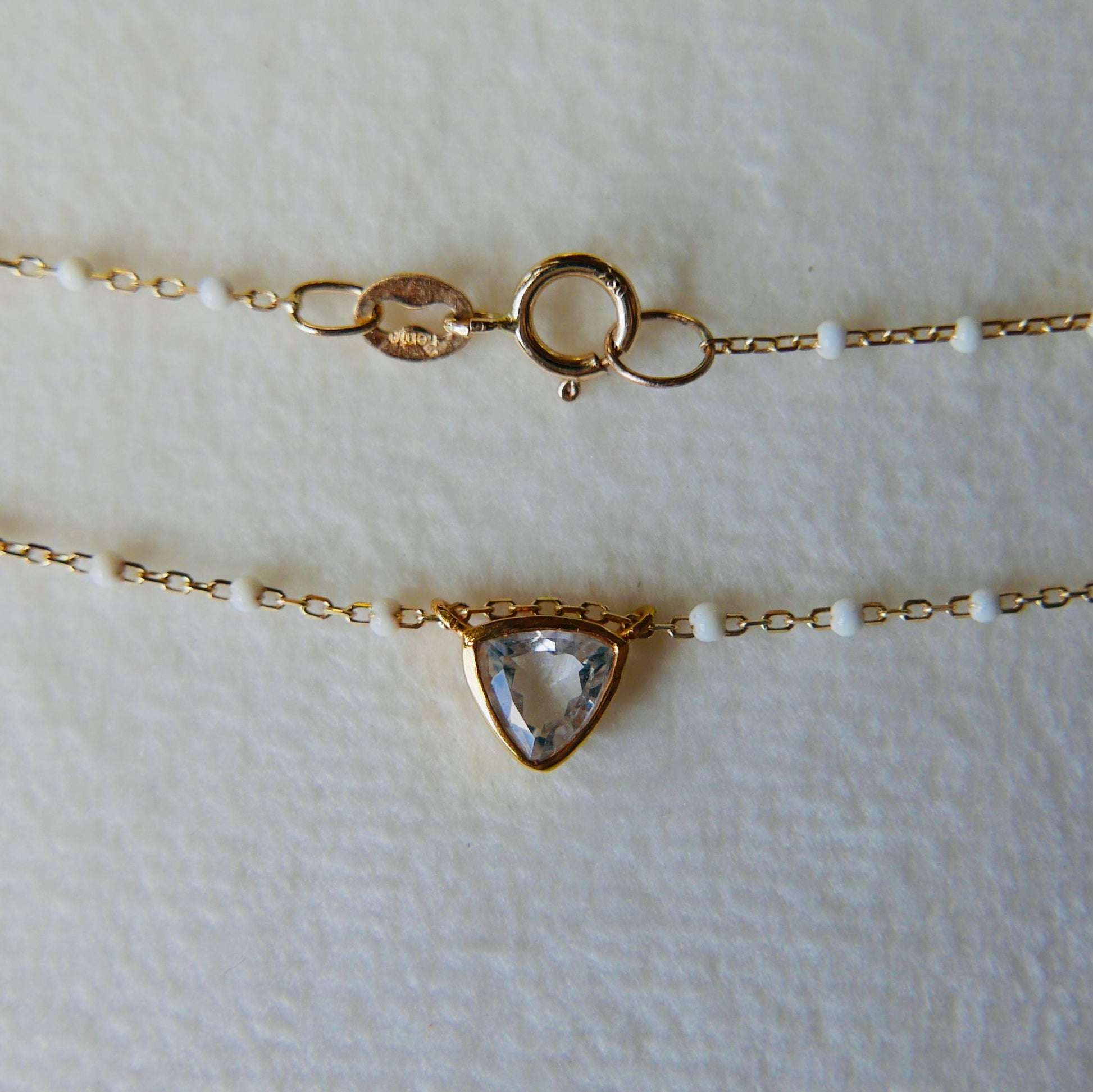 White aquamarine trillion 4 mm set in 18k yellow gold, white enamel chain, Lenght 42 cm