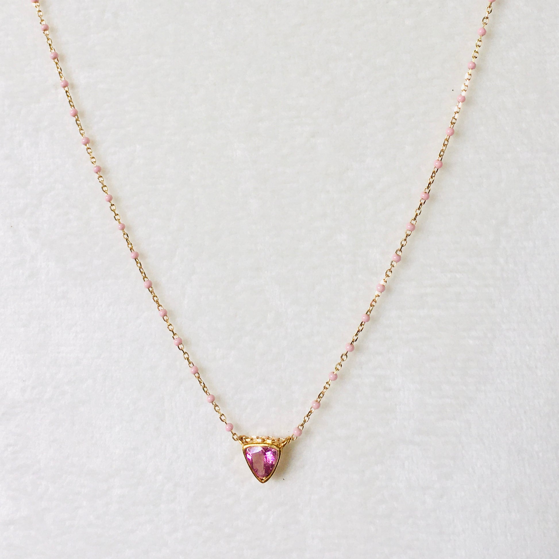 Pink tourmaline trillion 4 mm set in 18k yellow gold, baby pink enamel chain,Lenght 43 cm.