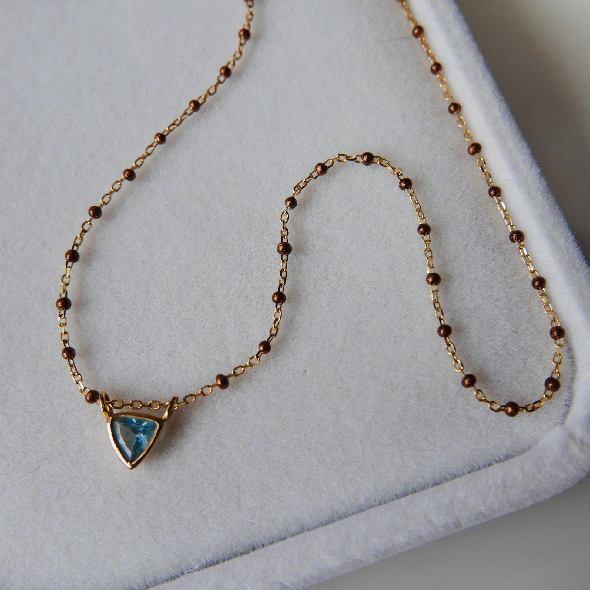 Blue tourmaline trillion 4 mm set in 18kt, bronze ( brown shimmering), lenght 42cm.