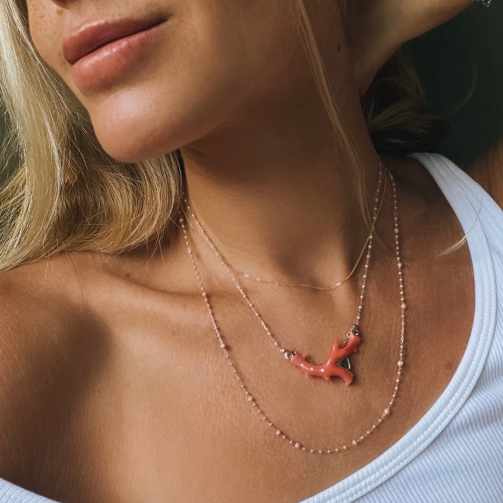 Deep sea momo coral necklace, natural shape and vibrant color with blue and green tourmalines and diamond inlay.