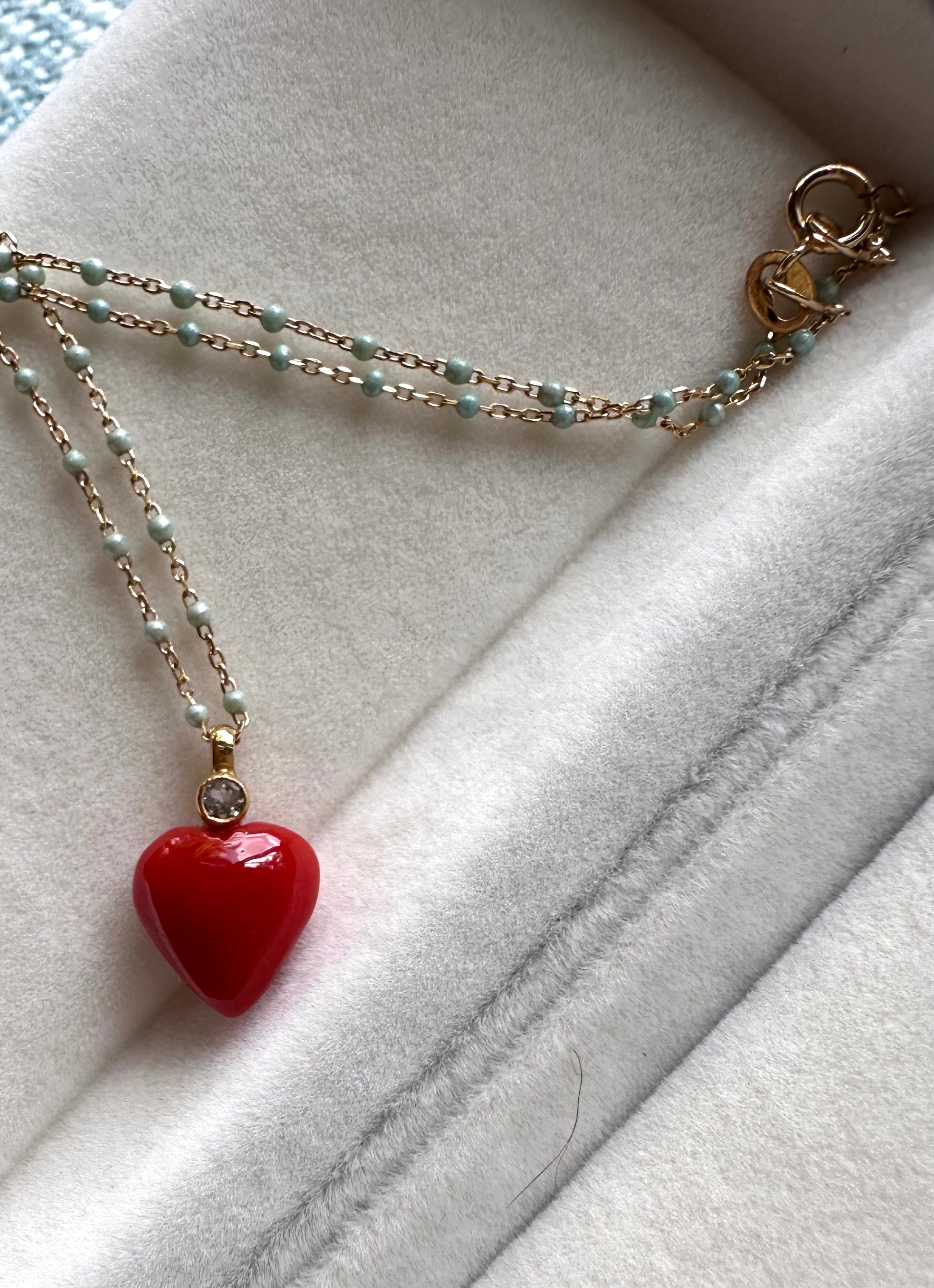 Red Aka coral heart shape with small round aquamarine bail pendant. The dimension of the pendant is 13 mm including setting.