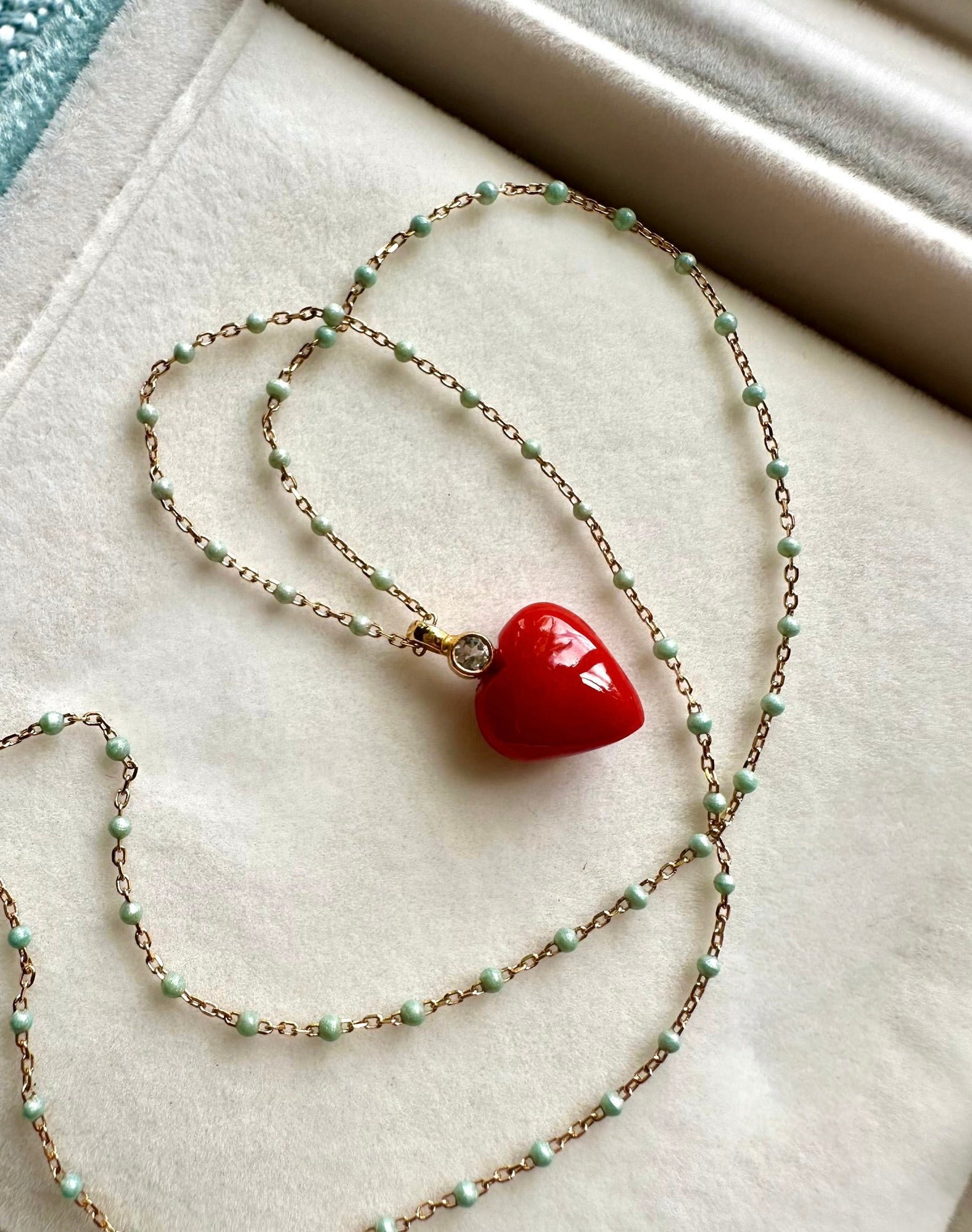 The chain is enameled by hand in a light baby blue -shimmering- to match the aquamarine.